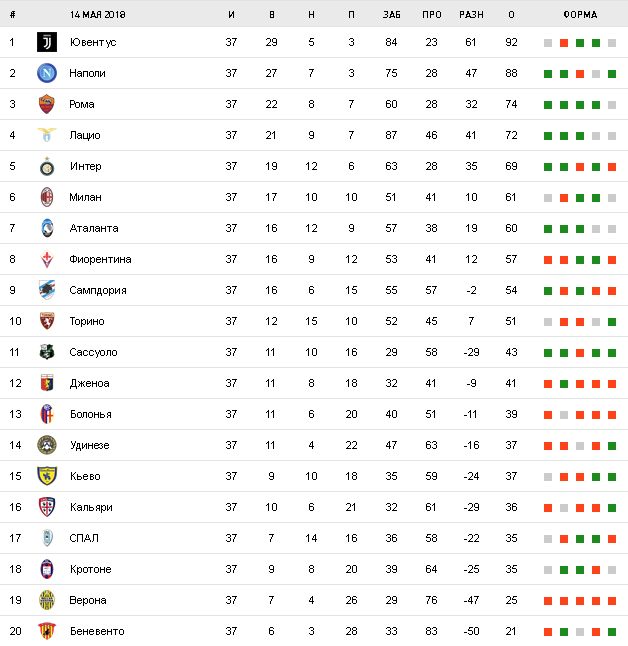 То, что было ясно уже после поражения Наполи от Фиорентины и победы Ювентуса над Интером в тридцать пятом туре чемпионата Италии, официально оформилось в тридцать седьмом. Преимущество "старой синьоры" за тур до финиша составляет четыре очка, и "бьянконери" можно поздравить с завоеванием очередного скудетто – седьмого кряду.
