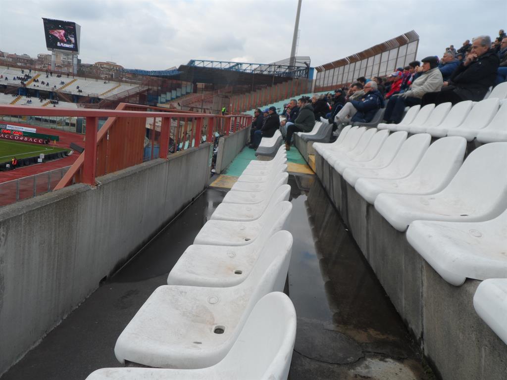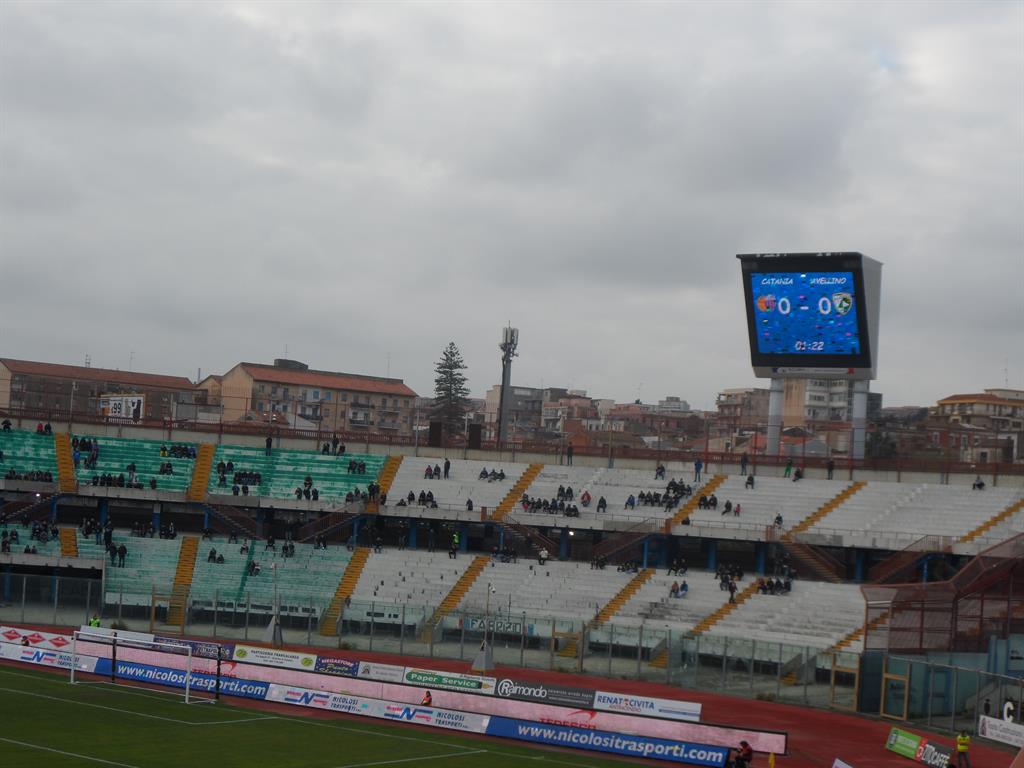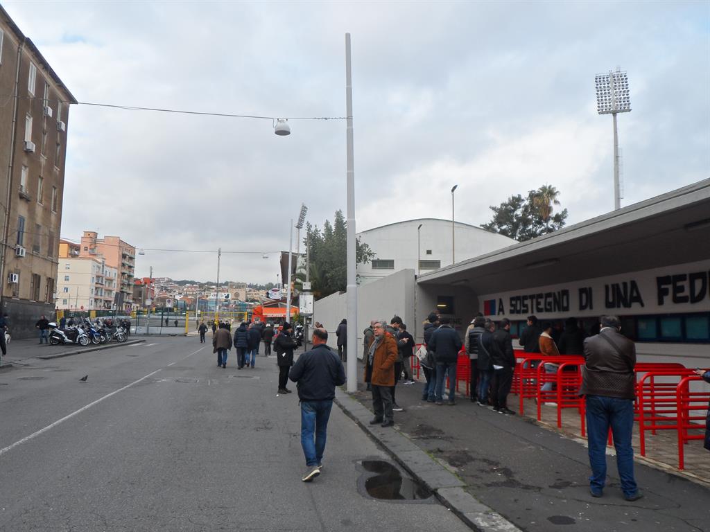Серьезно выглядящий турникет, затем обязательный досмотр – и ваш автор заходит на трибуну одновременно со стартовым свистком. Открывшееся зрелище несколько удручает. Не секрет, что на 20-тысячный Анджело Массимино в этом сезоне ходят по 6-7 тысяч зрителей, но поединок с Авеллино бойкотировали ультрас Катаньи, недовольные финансовым положением клуба и затянувшимися переговорами об его продаже. "Курва Норд" фактически пустая. "Обычно она полностью заполнена", – уверяет Антонио, сосед по трибуне, дружелюбный мужчина лет 50-ти. "Жаль, что ты не почувствуешь настоящую атмосферу матча Катаньи". Двухъярусная арена выглядит грустно: пустые грязные сиденья, лужи в проходах (с утра шел дождь, а крыша есть только над центральной трибуной), едва работающее табло. Зато со второго яруса видно соседние живописные дома, а +13 и легкий ветерок словно переносят из января куда-нибудь в октябрь.