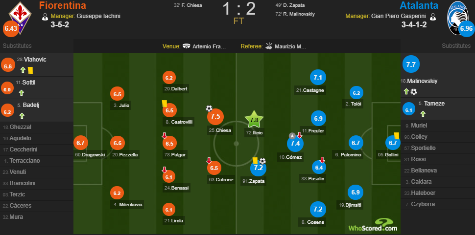 "Фиорентина не отказывалась от своей игры, но именно Аталанта вышла вперед: гол с левой ноги от вышедшего на замену Малиновского, но не без вины Драговски".