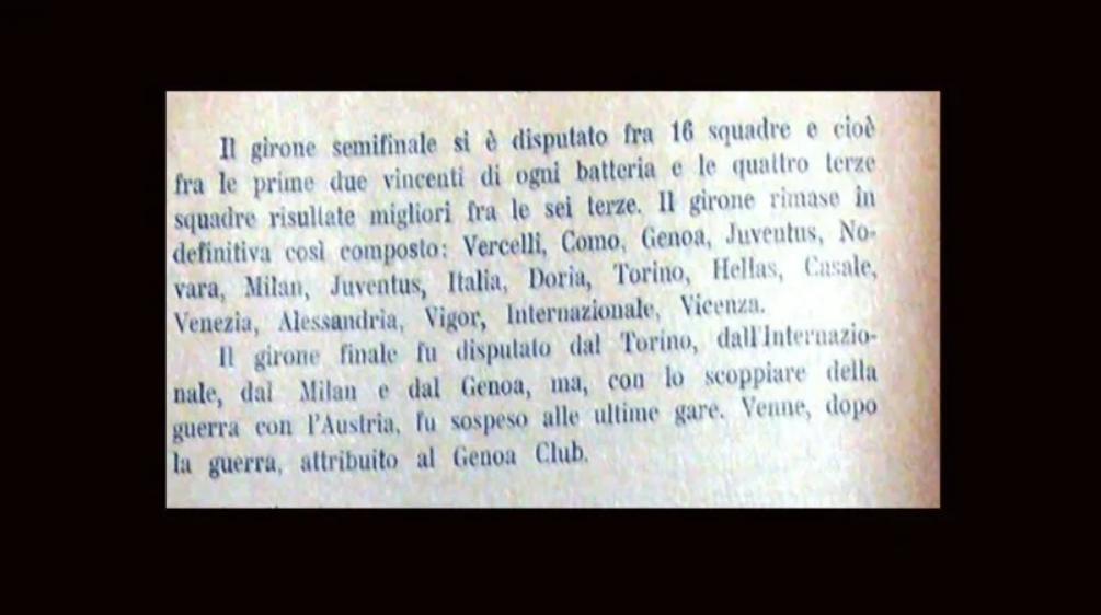 Дело в том, что в те времена чемпионат Италии проводился в трех географических зонах: Север, Центр и Юг, а титул доставался победителю матча между лучшей командой Севера и объединенным чемпионом Юга и Центра. Чемпионат Севера выиграла Дженоа, Юга и Центра — Лацио, но между собой они так и не сыграли.