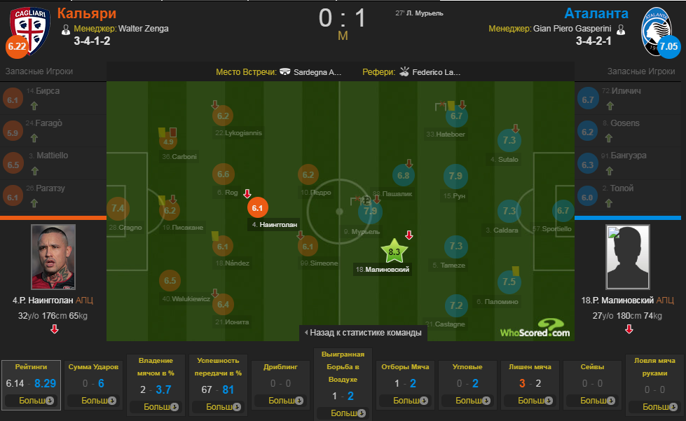 Всего Малиновский провел в матче с Кальяри 59 минут, после чего его заменил Алехандро Гомес. Специализированный портал поставил Руслану наивысшую оценку — 8,29.