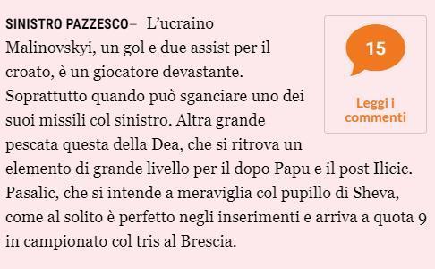"Сумасшедшая левая! Украинец Малиновский, автор гола и двух ассистов на Пашалича, восхитительный игрок. Особенно когда ему удается отправить в цель одну из нескольких своих ракет левой ногой. Очередное великолепное подписание для Аталанты. Ученик Шевы прекрасно взаимодействует с Пашаличем, который благодаря хет-трику в этом матче забил уже девять голов в нынешней Серии А".