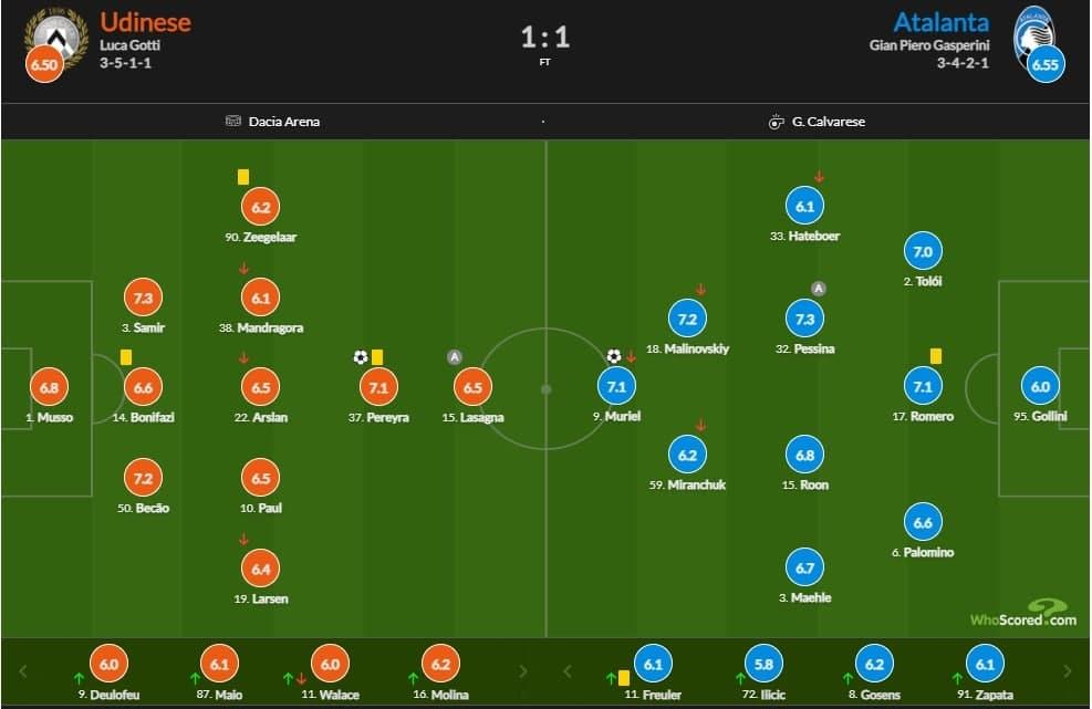 Так лучшим игроком встречи стал Маттео Пессина с баллом 7,3. У Удинезе Самир также получил аналогичную оценку.