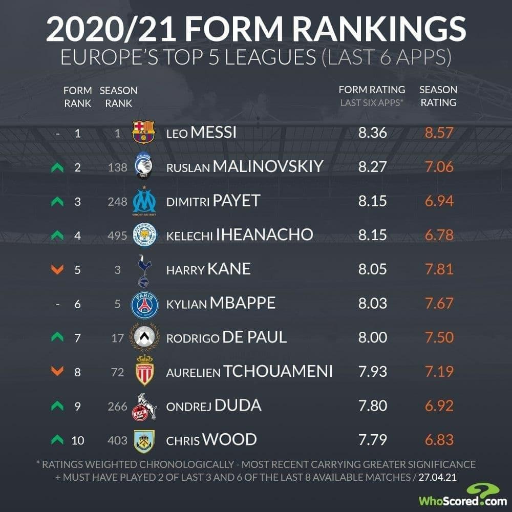 Статистический портал Whoscored оценил футболистов ТОП-5 ведущих европейских лиг в последних шести матчах.