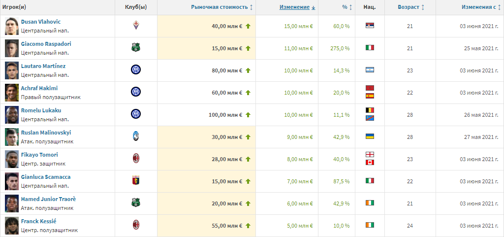 ТОП-10 самых подорожавших игроков Серии А по версии Transfermarkt выглядит следующим образом: