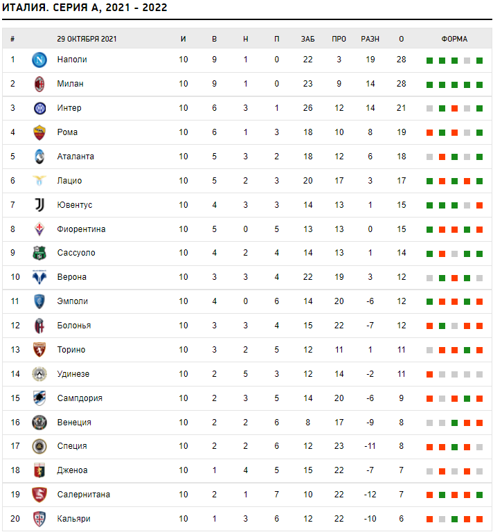 В нижней части таблицы обращаем внимание на победу Салернитаны над Венецией, которая позволила "морским конькам" подняться с 20-го места, отправив туда Кальяри. Другой вопрос, что состав зоны вылета остался прежним. Плотность до сих пор высокая, однако с каждым туром всё яснее становится круг борцов за выживание. Явно этого не избежит Специя, всё глубже вязнут Кальяри с Дженоа, да и по другой генуэзской команде имеются вопросы, а вот Эмполи пока держится на расстоянии благодаря запасу очков.