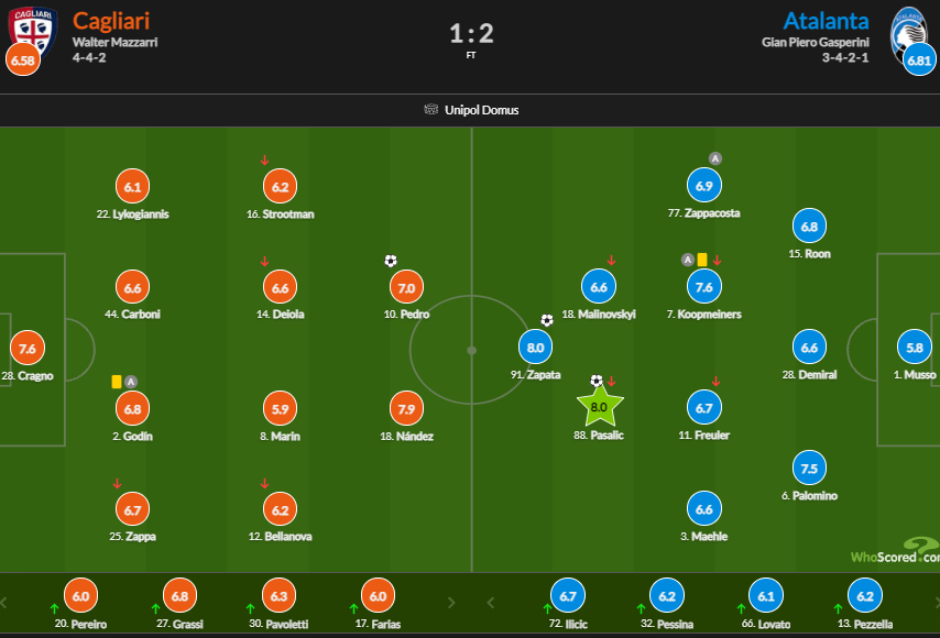 В матче 12-го тура Серии А Аталанта обыграла на выезде Кальяри со счетом 2:1.