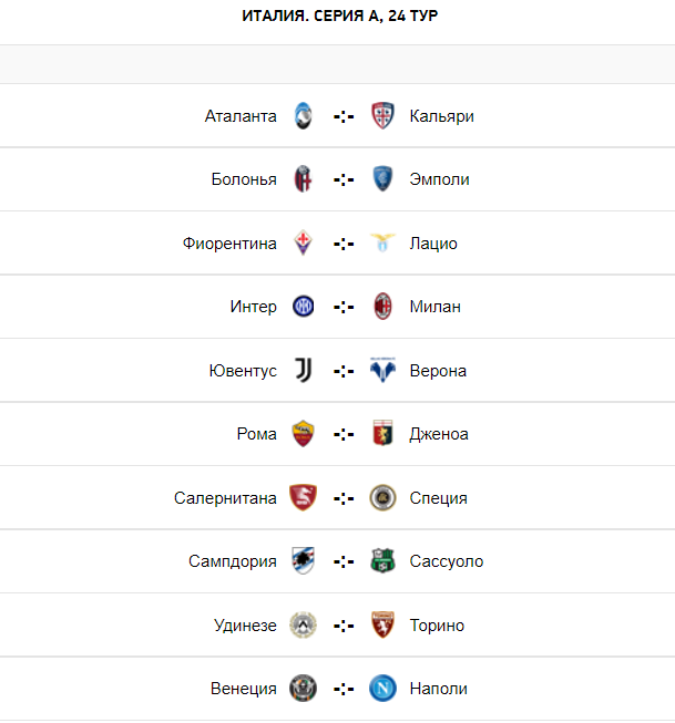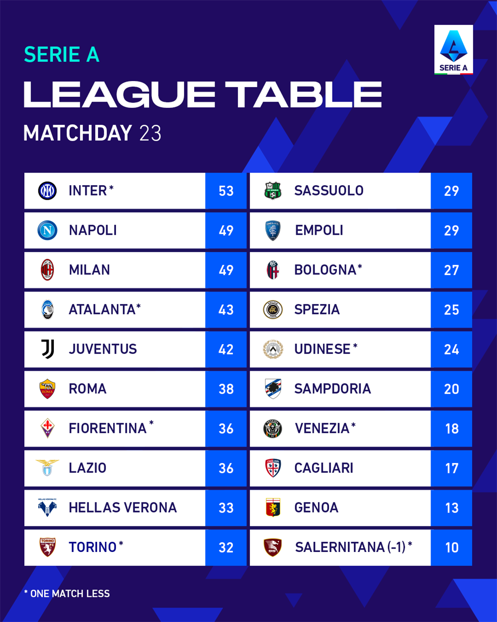 Турнирные изменения застряли на полпути. Интер, сумев дожать Венецию, оторвался от конкурентов на четыре очка (плюс матч в запасе). Наполи догнал Милан, а вот Ювентус так и не сумел обойти Аталанту, хотя в случае победы занял бы место в зоне Лиги чемпионов. Впрочем, вся борьба ещё впереди, хотя ещё в начале года лидирующая четвёрка держалась на расстоянии от конкурентов.