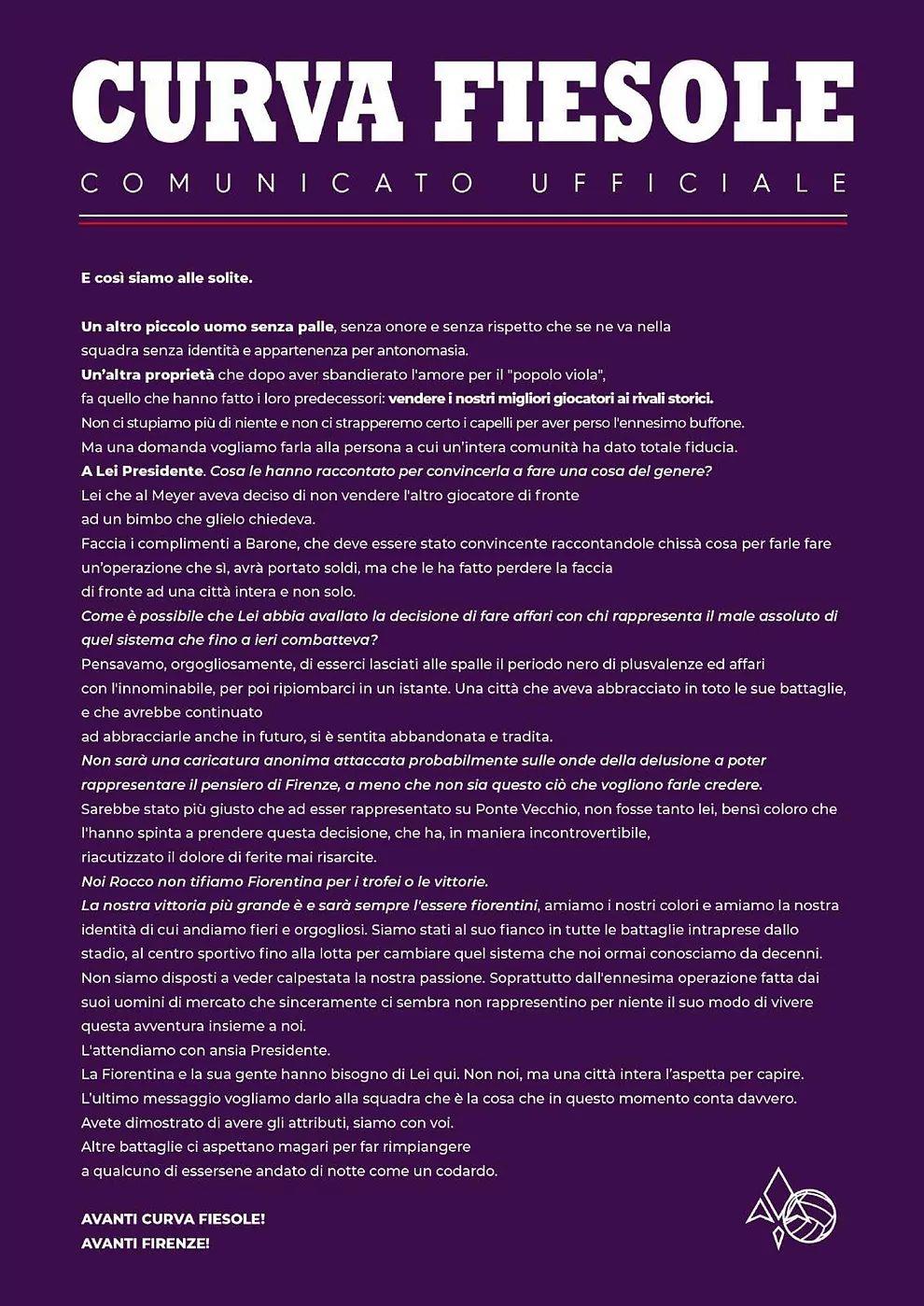 Негативно восприняли продажу лучшего нападающего клуба и фанаты Фиорентины из группировки Curva Fiesole, разместив соответствующее обращение на своем ресурсе.
