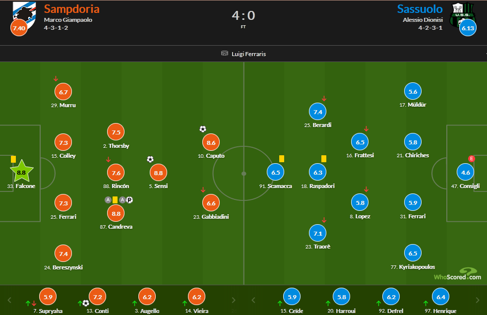 Нападающий Владислав Супряга был худшим в составе Сампдории в сегодняшнем матче с Сассуоло (4:0) по версии портала Whoscored.