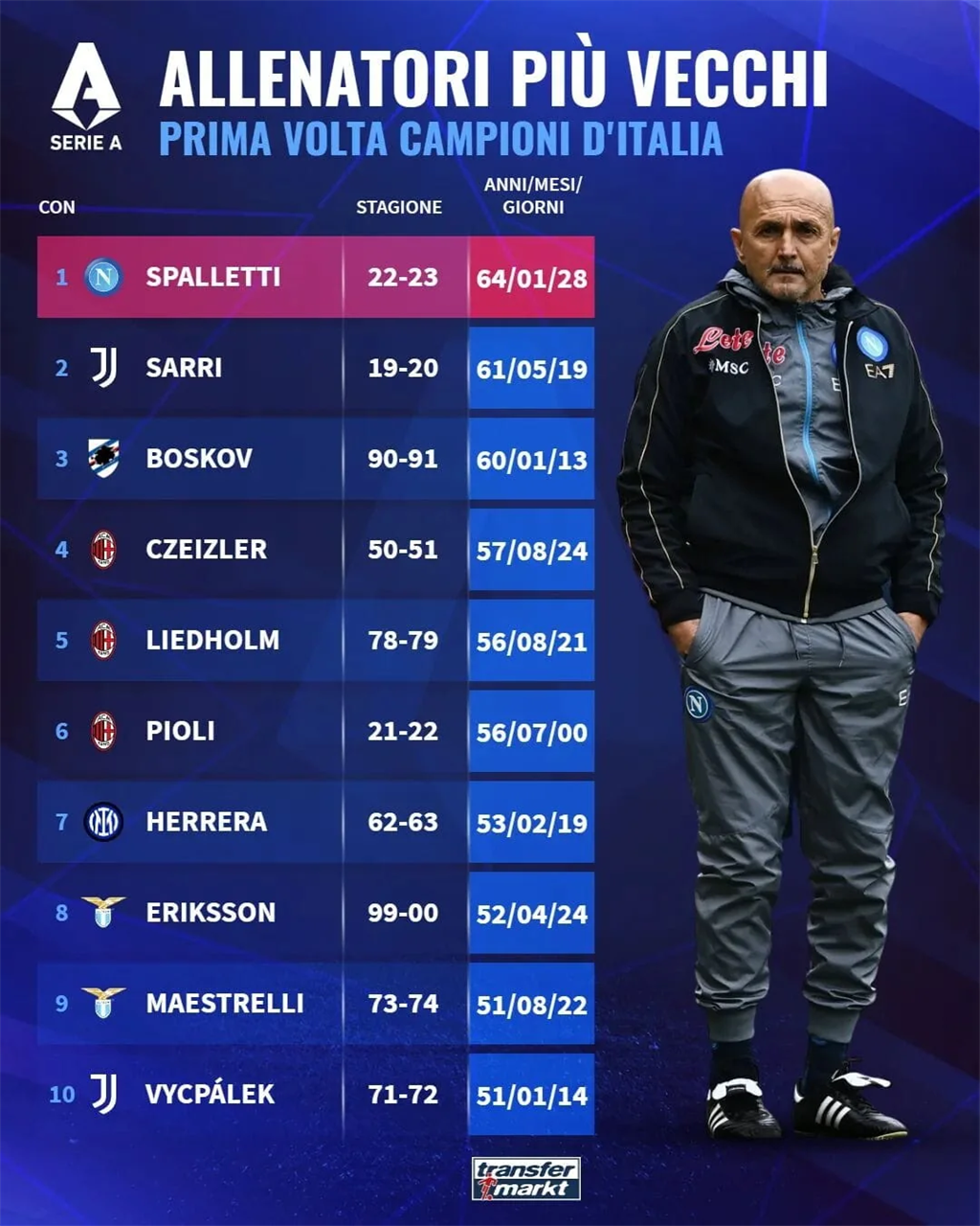 Лучано Спалетті став найстаршим наставником в історії Серії А, який вигравав своє перше скудетто в тренерській кар'єрі - повідомляє відомий портал Transfermarkt.