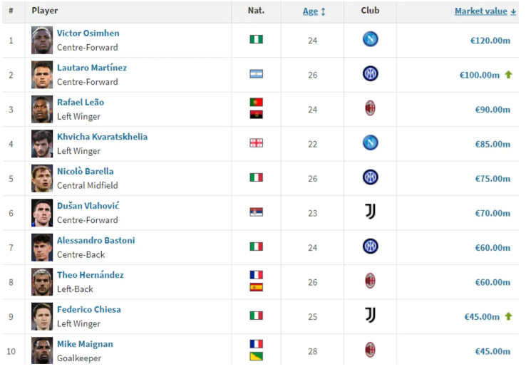 Список із десяти найдорожчих гравців італійської Серії А за версією Transfermarkt виглядає наступним чином: