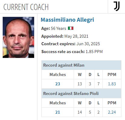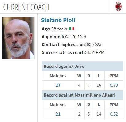 У головного тренера Мілана Стефано Піолі досить погана статистика як у протистояннях з Ювентусом, так і у протистояннях з головним тренером туринців Массіміліано Аллегрі.