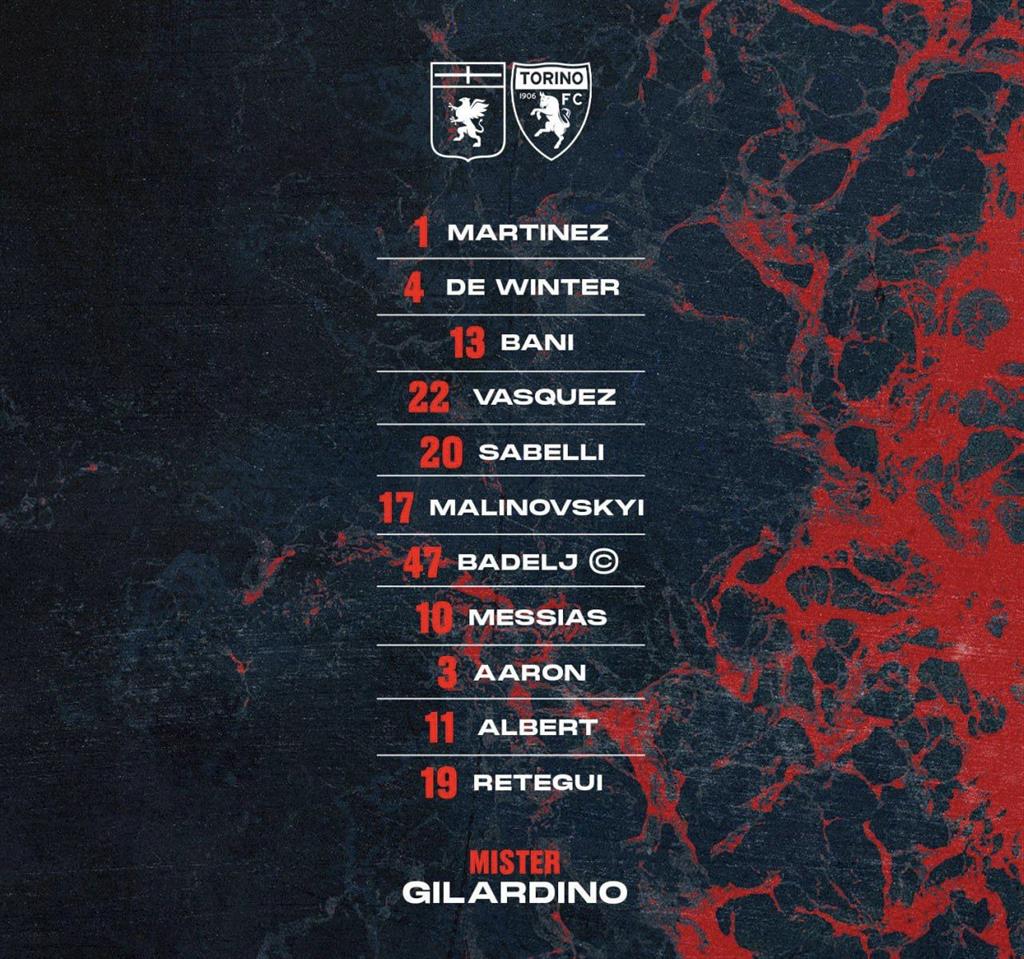 Дженоа: Джозеп Мартінес — Маттіа Бані, Стефано Сабеллі, Хоан Васкес, Аарон Мартін, Коні Де Вінтер - Джуніор Мессіас, Альберт Гудмундссон, Руслан Маліновський, Мілан Бадель — Матео Ретегі.