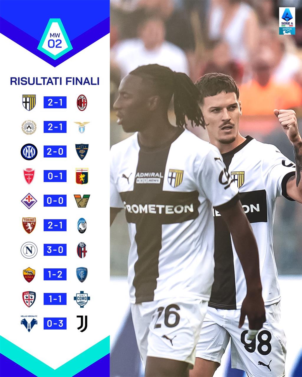 Ювентус під керівництвом Тіаго Мотти вдруге поспіль закрив тур своєю звитягою з рахунком 3:0. Цього разу "б'янконері" впоралися на виїзді Вероною, якій не вдалося бодай наблизитися до свого успіху в першому турі, коли колектив Паоло Дзанетті з ідентичним рахунком здолав Наполі.