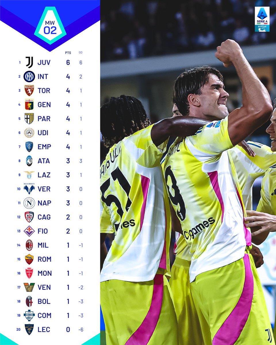 Вперше з сезону-2010/11 лише одна команда (зараз Ювентус, а тоді К'єво) має шість очок після перших двох турів Серії А.