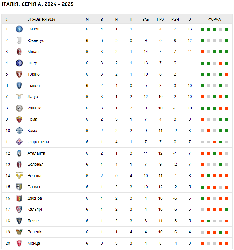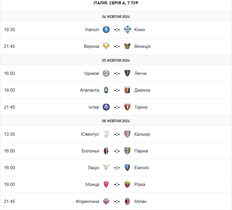 Сезон-2024/25 в італійській Серії А триває. Одразу вісім представників турніру брали участь у матчах, Ліги чемпіонів, Ліги Європи та Ліги конференцій серед тижня, тоді як інші дванадцять колективів готувалися до сьомого туру чемпіонату Італії, який своїм протистоянням сьогодні відкриють Наполі та Комо.