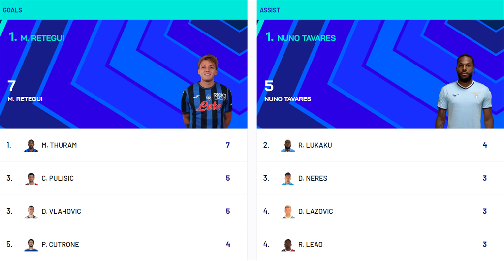 Лише Луїс Муріель (8) забив більше голів, ніж Матео Ретегі (7) в своїх перших семи матчах Серії А за Аталанту (ера трьох очок за перемогу, із сезону-1994/95).