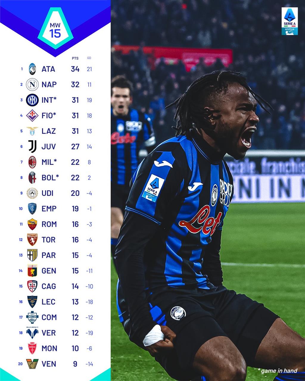 Аталанта з 34-ма очками проводить найкращий для себе старт (перші 15 турів) у Серії А. Лише вдруге клуб одноосібно очолює турнірну таблицю, відколи чемпіонат знову почав складатися з 20 команд (2004/05). Вперше "нерадзуррі" були на вершині після 5 туру Серії А-2022/23.