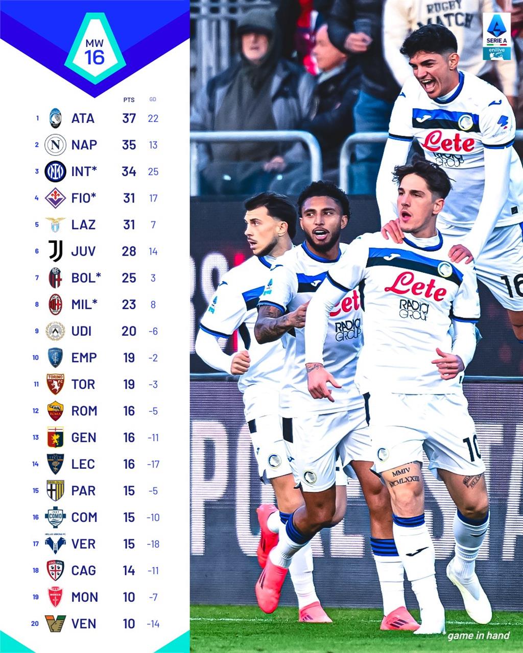 Аталанта вперше в історії має серію з 10 перемог у чемпіонаті Італії. Клуб перебуває на вершині турнірної таблиці Серії А за підсумками принаймні двох ігрових тижнів поспіль вперше після повернення змагання до формату з 20-ма учасниками (із сезону-2004/05).
