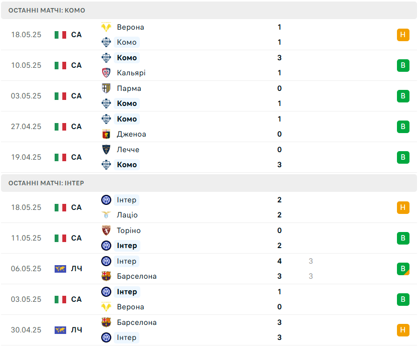 У рамках останнього, 38-го туру італійської Серії А-2024/25 Комо на власному полі зустрінеться з Інтером.