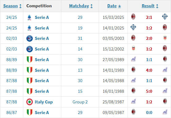 У матчах проти Мілана Комо не знає смаку звитяг уже понад 41 рік. У січні 1985-го міланський гранд зазнав домашньої поразки з рахунком 0:2 у Серії А, після чого уникнув невдач у наступних 14-ти протистояннях (9В, 5Н) в усіх турнірах. У XXI столітті "б'янкоблу" жодного разу не зуміли відібрати залікові бали в "россонері", двічі пропустивши від них у кожній із чотирьох дуелей.