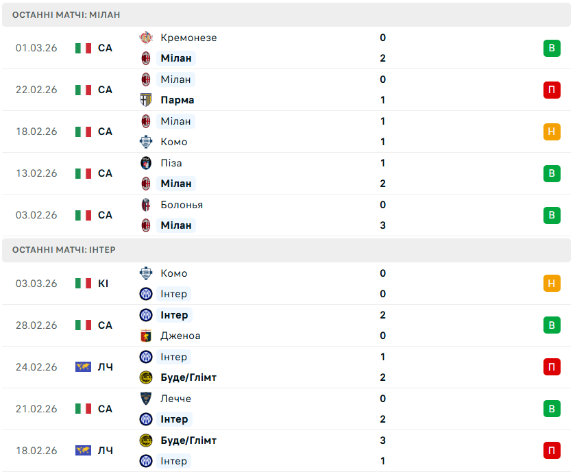 Серед тижня Інтер очікувано не був активним у першому, виїзному поєдинку з Комо (0:0) в 1/2 фіналу Кубка Італії, зекономивши сили. Після міського дербі минулої осені колектив Крістіана Ківу не програвав у чемпіонаті країни, а от Мілан нещодавно поступився вдома Пармі (0:1) і попрощався зі своєю безпрограшною серією, що стартувала ще в другому турі.