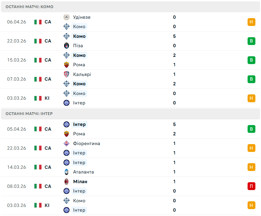 Вчора ж підопічні Лучано Спаллетті втримали виїзну перемогу над Аталантою (1:0), обійшовши Комо в турнірній таблиці, тож команда Сеска Фабрегаса намагатиметься повернутися на четверту сходинку. Після домашньої поразки від Фіорентини в лютому (1:2) вона уникнула невдач у семи поспіль поєдинках Серії А (5В, 2Н), зокрема впоравшись на виїзді з Ювентусом (2:0) і Ромою вдома (2:1).