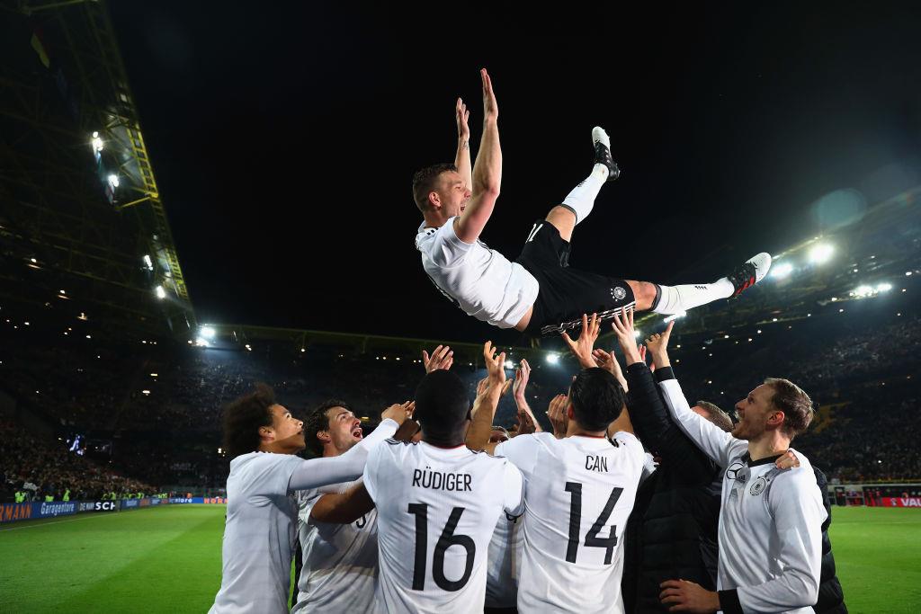 Простился Лукас с Бундестимом 22 марта 2017 года в товарищеском матче против Англии (в котором забил свой последний мяч), сыграв 130 матчей (49 голов). Кроме того, на его счету самый быстрый гол сборной Германии — на 9-й секунде товарищеского матча против Эквадора. Этот гол, кстати, является вторым самым быстрым в истории всех национальных сборных.