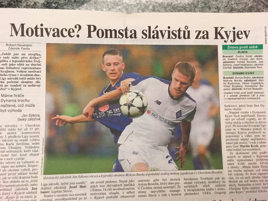 Команда журналистов, в свою очередь, была размещена во втором по величине городе Чехии — Брно. В день матча наше внимание привлекла местная пресса. Чешские представители СМИ до сих пор не простили киевскому Динамо проход пражской Славии в квалификации Лиги чемпионов этого сезона, в связи с чем одна из газет вышла с громких заголовком — "Мотивация? Отомстить Киеву!". Более того, журналисты даже упомянули, что в составе нынешней сборной Чехии выступает аж 8 игроков Славии.
