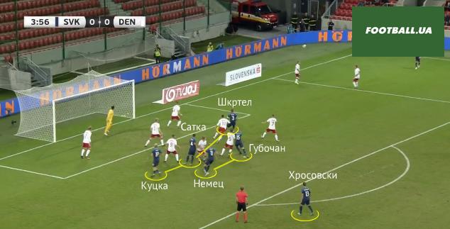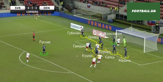 На угловых в штрафной задействованы 5 игроков: Шкртел, Сатка, Куцка, Губочан, Немец. Первые три формируют «1-й эшелон», Губочан и Немец – «2-й эшелон». Хросовски действует на подборе.