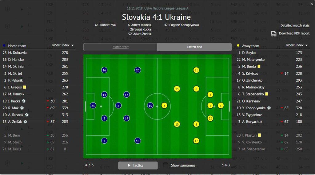 Футболисты сборных Украины и Словакии получили оценки от аналитического издания InStat.