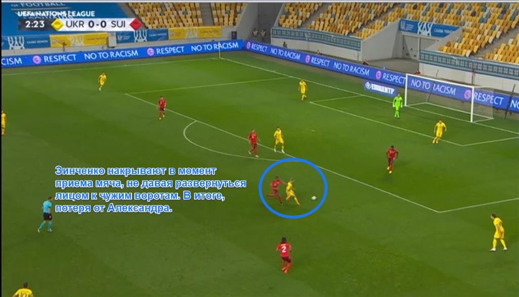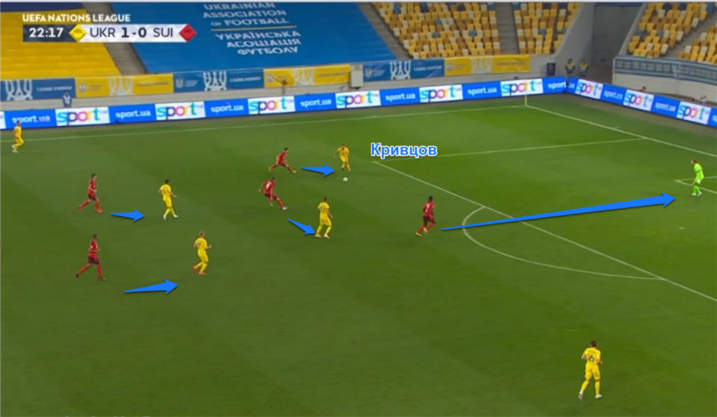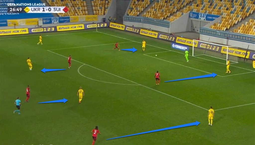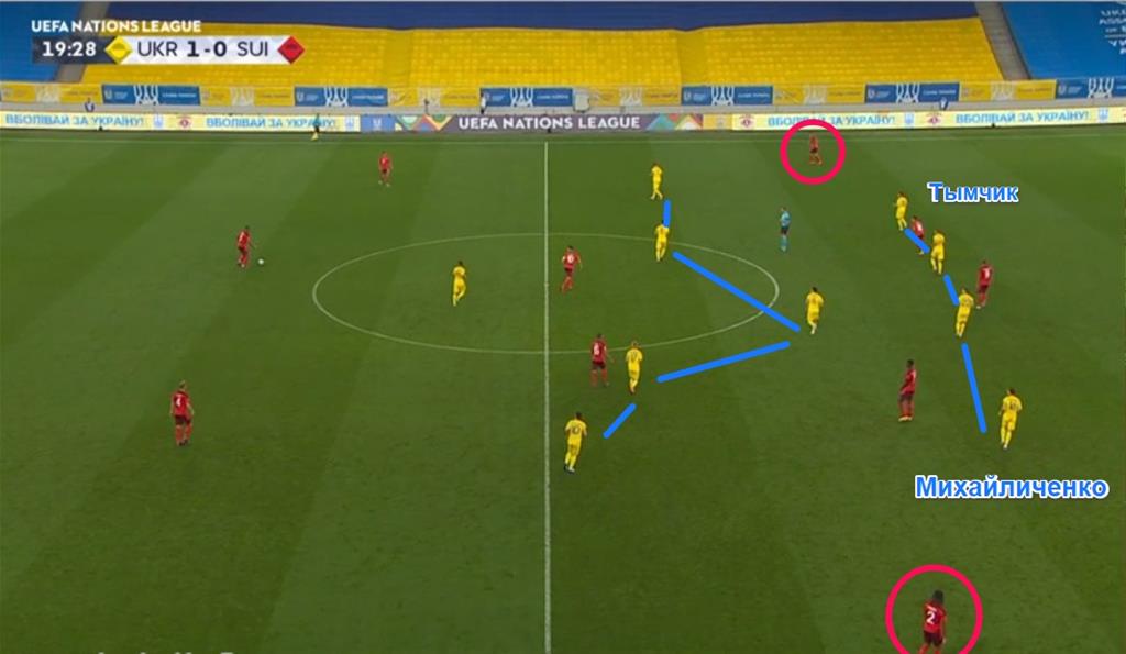 Образцовый эпизод возник на 23-й минуте. Украина выманила Швейцарию в высокий прессинг, из которого команда Шевченко вышла отличной средней вертикальной передачей.