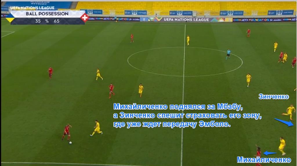 Разберем еще один любопытный момент, о котором сказал Шевченко на пресс-конференции, но, возможно, кто-то не понял, что главный тренер имел ввиду. Звучало приблизительно так: "Но, если же мы садимся глубже в момент длинной передачи соперника, крайний защитник никогда не выходит на пятого игрока Швейцарии (крайнего — прим.). Мы запрещаем, чтобы пара наших центральных защитников оставалась 2 в 2 против нападающих Швейцарии".