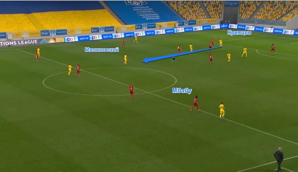 Малиновский расположился между линиями, оказавшись один в 30-метровой зоне. Мбабу, учитывая, что три наших атакующих футболиста играют по защитникам, вынужден был опускаться ниже и играть с Коноплянкой.