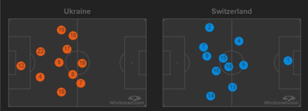 3. Сборная Украины чаще позиционно оборонялась, нежели атаковала. Швейцария имела преимущество и в плане контроля мяча (57% на 43%), и в плане количества передач (543 против 449), точность пасов, кстати, равная (86% на 86%). То, что "сине-желтые" больше защищались позиционно, изображено на карте усредненных позиций футболистов от Whoscored.