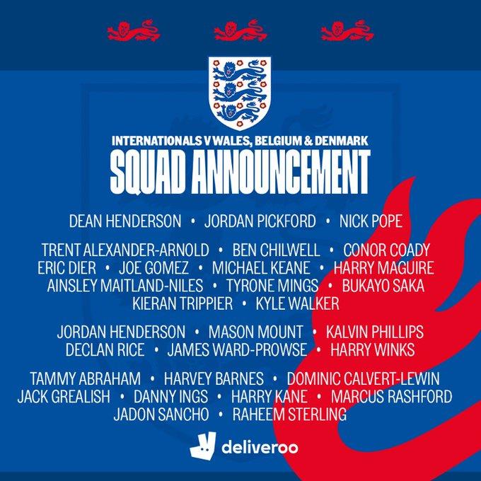 В список вошли 30 игроков, из них 3 потенциальных дебютанта, которые впервые получили вызов в национальную команду: нападающий Эвертона Доминик Калверт-Льюин, защитник Арсенала Букайо Сака и полузащитник Лестера Харви Барнс.