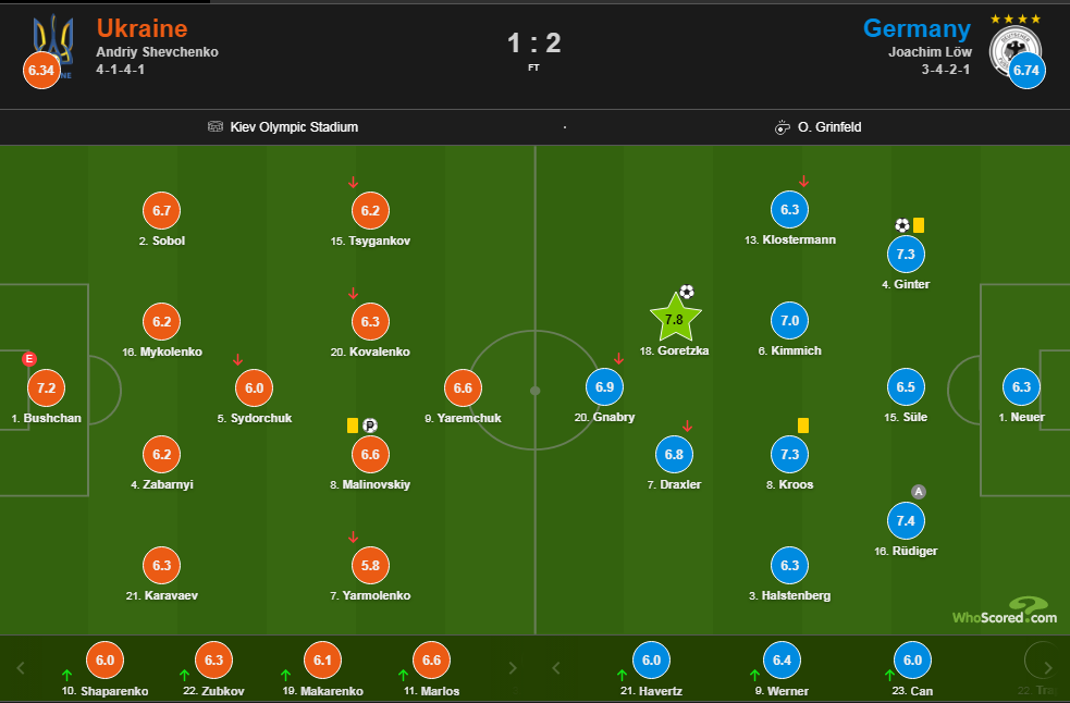 Лучшим игроком поединка стал полузащитник сборной Германии Леон Горецка (7,8), отличившийся одним из голов.