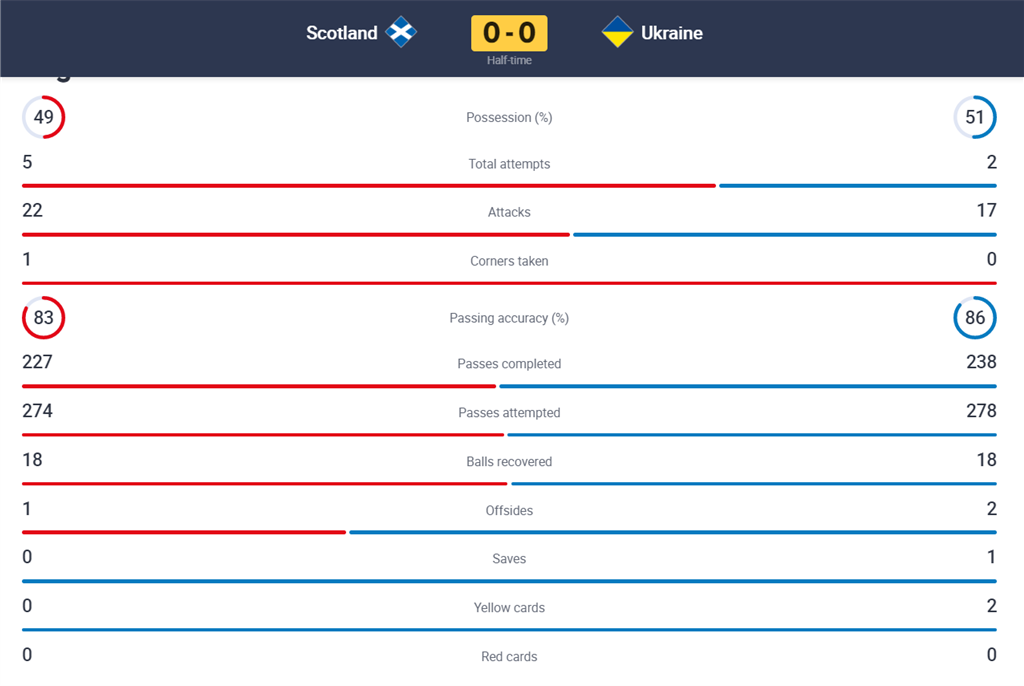 У рамках поєдинку Ліги націй дивізіону B збірна Шотландії приймає на своєму полі Україну. Перша половина зустрічі завершилася нульовою нічиєю.