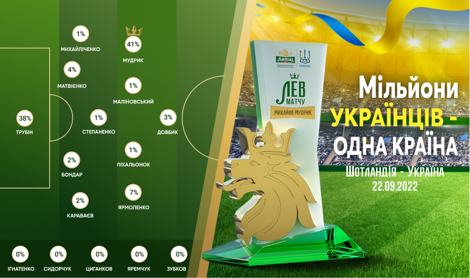 За підсумками голосування за підтримки спонсора збірної України ТМ Львівське приз "Лев матчу" у грі проти Шотландії отримав нападник нашої національної команди — Михайло Мудрик, який запам’ятався вболівальникам, передусім, значною перевагою в швидкості над суперниками в окремих епізодах.