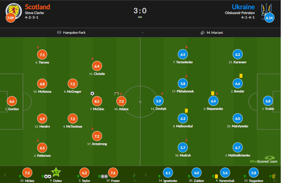 Що стосується збірної України, то найвища оцінка в воротаря Анатолія Трубіна — 6,8. Найгірший гравець цього матчу Михайло Мудрик — 5,7.