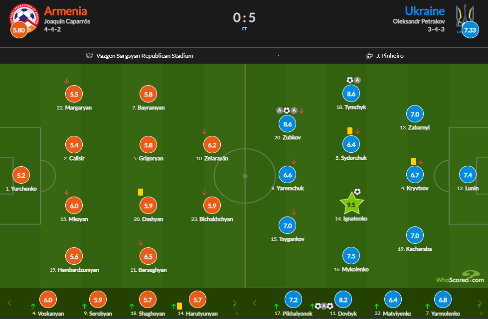 Найкращим гравцем поєдинку став Данило Ігнатенко з балом 9,5. Він, до речи, забив свій дебютний гол за національну команду.