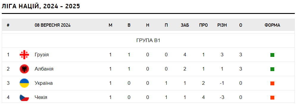 У стартовому матчі Ліги націй групи B1, в якій виступає Україна, збірна Чехії з розгромом поступилася Грузії, пропустивши від картвелів аж чотири голи (1:4).