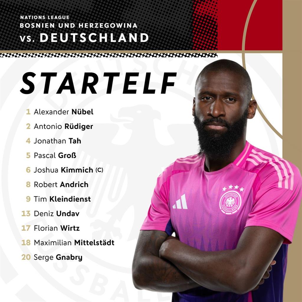 Головний тренер німців Юліан Нагельсманн прийняв рішення залучити до стартового складу одразу двох дебютантів. Із перших хвилин гратимуть голкіпер Александер Нюбель (Штутгарт) і нападник Тім Кляйндінст (Боруссія Менхенгладбах).