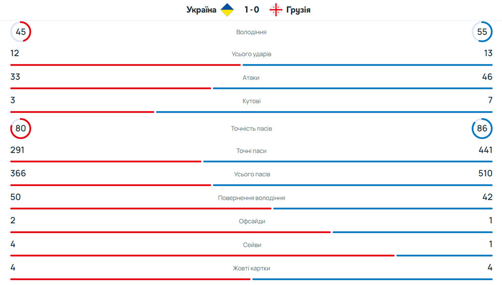 За першу половину зустрічі "синьо-жовті" завдали дев'ять ударів у бік воріт суперника, один із яких вирушив у площину воріт (гол Мудрика). У збірної Грузії, у свою чергу, всього п'ять ударів та два у площину.