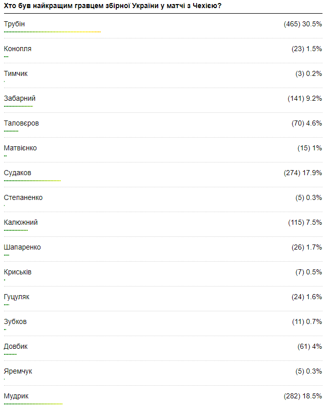 Так, за результатами опитування, найкращим гравцем збірної України у матчі з Чехією став воротар Анатолій Трубін, який набрав 30,5% голосів. Другим став вінгер Михайло Мудрик із 18,5% голосів, а трійку найкращих замкнув центральний півзахисник Георгій Судаков (17,9%).