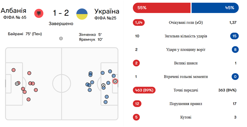 СТАТИСТИКА МАТЧУ АЛБАНІЯ — УКРАЇНА