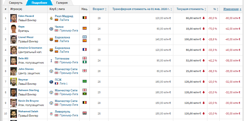 Первое место в рейтинге досталось вингеру Реала Эдену Азару, который после ухода из Челси так и не смог набрать оптимальную форму. Он подешевел в два раза: со 120 миллионов евро до 60.