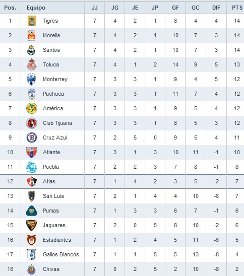 Турнирная таблица (msn.mediotiempo.com):