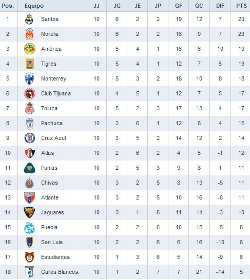 1. Смена лидера. Морелия не выдержала заданный себе же график, и после семи матчей без поражений потерпела сразу два подряд на своем поле – сначала в ЛЧ от Монтеррея, теперь вот и в чемпионате от Толуки. Догнавший лидера Сантос имеет абсолютно такие же статистические показатели, но забивает чуть больше, потому и в таблице номинально первый. Впрочем, плотность среди команд пока настолько высока, что в одночасье может поменяться многое.